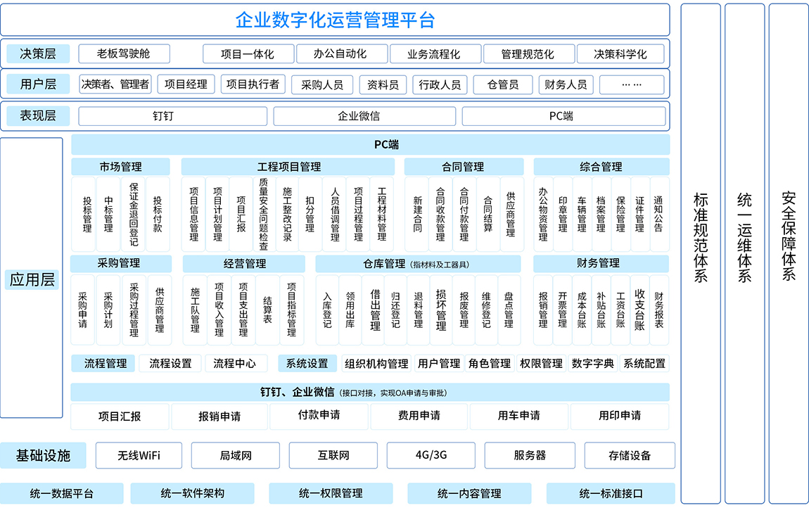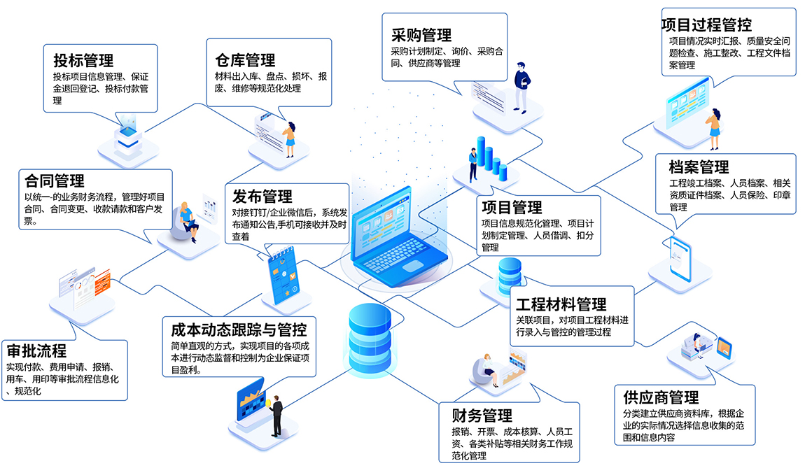 數(shù)字化管理系統(tǒng)對企業(yè)工程項目從項目投標中標、項目過程管理、合同管理、物資設備管理、采購管理、項目過程管理、施工隊管理、供應商、成本核算等進行全面綜合管理;縱向貫穿投標、采購、施工、竣工的全過程,橫向涉及公司內(nèi)部的各相關崗位,是一套全方位、集成的企業(yè)項目綜合管理平臺。通過對成本、進度、質(zhì)量、安全等方面的控制,以及對合同、結(jié)算、支付、資金等要素的管理,來提高工程類企業(yè)對工程項目的綜合配套能力。
